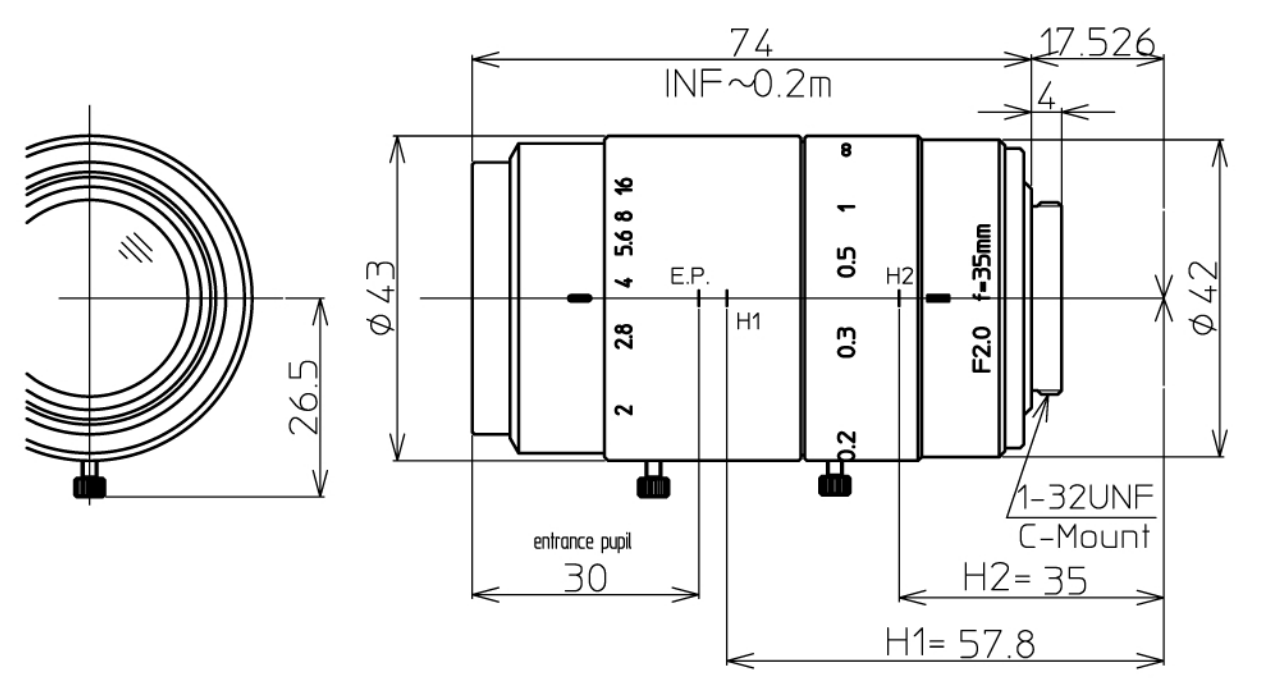 The Kowa LM35SC lens was designed for the latest generation of larger format image sensors. Having an image circle of 16 mm, we recommend pairing it with cameras having a 10 to 16 mm (up to 1" format) sensor.